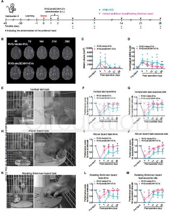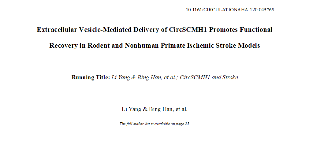 [1] Yang L, Han B, Zhang Z, et al. Extracellular Vesicle-Mediated Delivery of CircSCMH1 Promotes Functional Recovery in Rodent and Nonhuman Primate Ischemic Stroke Models. Circulation. 2020; doi:10.1161/CIRCULATIONAHA.120.045765