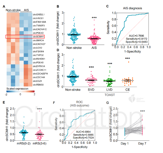 下一步检测circSCMH1是否与中风的预后相关。Mann-Whitney U检验显示,circSCMH1水平在预后较好的患者中更高。使用ROC检测circSCMH1对AIS的预后作用,AUC是0.6864,有68.85%的敏感度和70.24%的特异度。并且在排除年龄、高血压和既往TIA、中风和MI等血管危险因素后,circSCMH1仍然可以作为预后指标。除此之外,发现AIS患者入院治疗7天后,circSCMH1水平显著升高。以上结果表明中风导致circSCMH1水平下降,并且它具有作为AIS的诊断分子和预后分子的潜力。