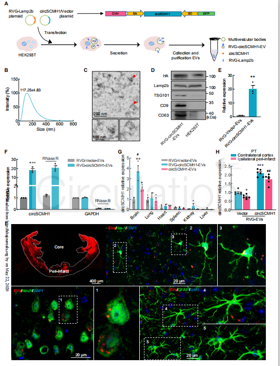 细胞外囊泡(EV)是由细胞释放的直径为30到150 nm的脂膜囊泡,可以穿过血脑屏障(BBB),能够运输蛋白质、脂质和核苷酸。一项突破性的研究表明,狂犬病毒糖蛋白(RVG)可以通过融合蛋白溶酶体相关膜糖蛋白2b(Lamp2b)-RVG,定位于EV的表面,实现脑特异性靶向的潜力。作者利用同样的设计,制备靶向大脑的RVG-circSCMH1-EV,探讨circSCMH1在中风病理过程中的作用。用编码GNSTM-RVG-Lamp2b-HA和circSCMH1的质粒共转染HEK293T细胞,然后进行EV纯化。梯度离心法从培养细胞的上清液中分离出EV,使用纳米颗粒分析、电镜、qPRC和Western blot等方法对分离的EV进行了验证,结果表明RVG-circSCMH1-EV构建成功。