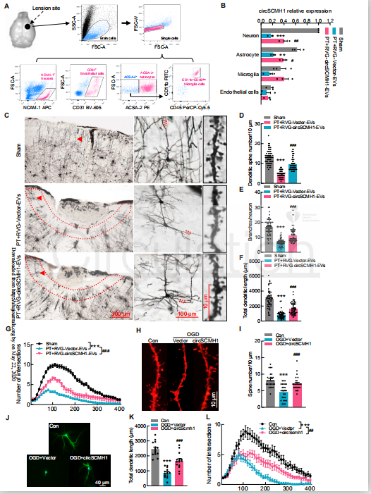 接下来,作者研究circSCMH1促进中风后功能恢复的细胞机制。用流式细胞仪对未中风组小鼠和PT组小鼠的神经元、星形胶质细胞、小胶质细胞和内皮细胞进行分类。原位杂交显示,circSCMH1集中在神经元、星形胶质细胞和小胶质细胞中。PT处理后显著减少了小鼠梗死周围皮质的棘突数目、轴突分支和树突长度,以及神经元交叉点的数目,并且这些表型都被RVG-circSCMH1-EV处理所改善。此外,RVG-circSCMH1-EV处理显著改善了PT小鼠突触相关蛋白PSD95和突触素水平的降低。