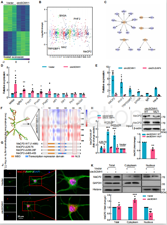 接下来,作者使用catRAPID算法分析circSCMH1与MeCP2的相互作用,预测到MeCP2的三个区域与circSCMH1具有高相互作用能力:MeCP2的残基26-76、236-287和403-453。通过RIP分析确定circSCMH1和MeCP2的结合需要残基26-76区域。此外,构建circSCMH1突变质粒证实了circSCMH1 426-485序列对于互作是重要的。为了确定circSCMH1和MeCP2的相互作用是否影响MeCP2的分布,进行了免疫荧光染色和western blot,发现细胞质中circSCMH1的异位表达增加了原代皮层神经元胞质中MeCP2的水平,并降低其在细胞核的水平。