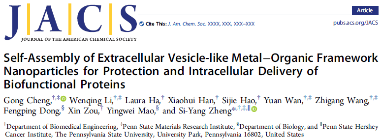 1. Cheng G, et al. Self-Assembly of Extracellular Vesicle-like Metal-Organic Framework Nanoparticles for Protection and Intracellular Delivery of Biofunctional Proteins[J]. J Am Chem Soc. 2018. Doi: 10.1021/jacs.8b03584.