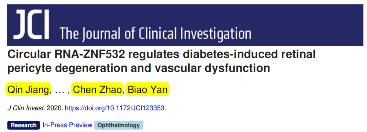 1. Jiang, Q., et al., Circular RNA-ZNF532 regulates diabetes-induced retinal pericyte degeneration and vascular dysfunction. J Clin Invest, 2020.
