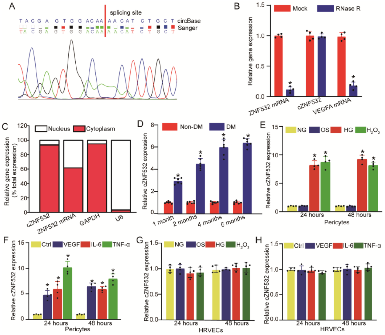 为筛选高糖诱导的高表达的circRNA分子,作者在人视网膜周细胞通过高通刺激后芯片分析差异表达circRNA分子,其中发现了来自ZNF532的一个circRNA,circ_0047814 (circBase ID:hsa_circ_0047814;circBank ID:hsa_circZNF532_007)。通过Sanger测序证明了Junction位点的序列,RNase R处理证明是环形分子。分离胞质和核组分结果显示cZNF532主要定位于胞质中。小鼠糖尿病模型不同时间段的视网膜血管细胞QPCR检测表明cZNF532在糖尿病模型中显著高表达。血管周细胞中高糖,氧化压力(H2O2处理)或炎症刺激(VEGF,IL-6,TNF-α处理)均可显著促进cZNF532的表达。人视网膜血管内皮细胞(HRVECs)中对应的变化不明显。说明高糖刺激后cZNF532会在视网膜血管周细胞中特异性的表达增高。