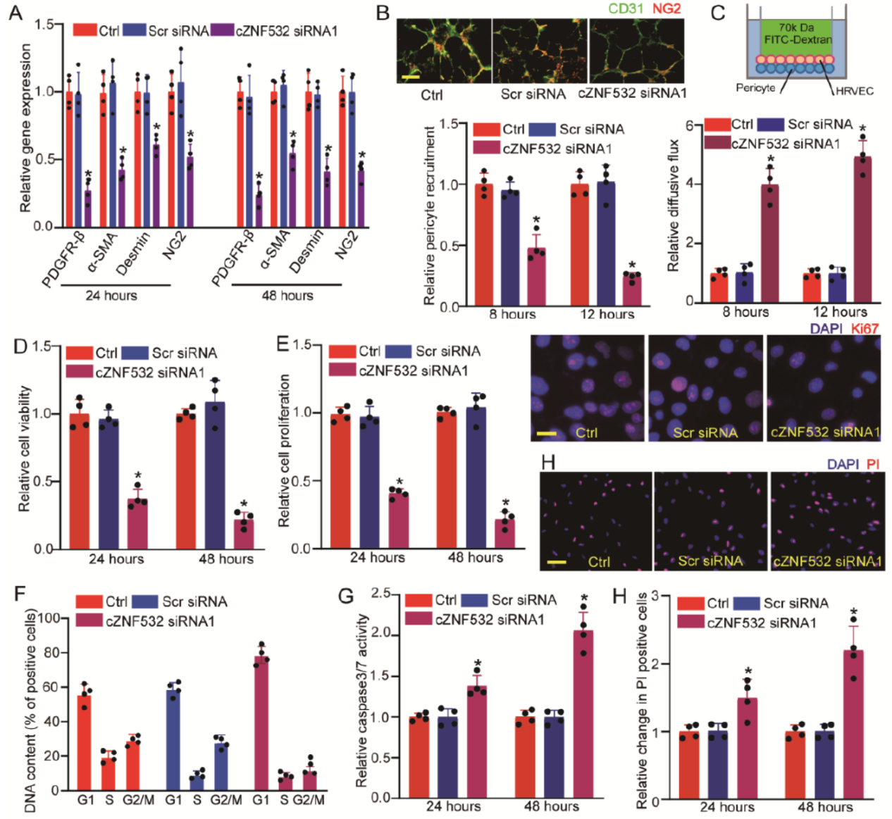 cZNF532特异性的siRNA能够有效敲降cZNF532,但对母基因ZNF532没有影响。血管周细胞中干扰cZNF532可显著降低周细胞标志物的表达,如(PDGFR)-β,α-SMA,Desmin以及NG2。Matrigel共培养实验表明干扰 cZNF532显著降低血管周细胞向HRVECs聚集的能力,并且增加周细胞对大分子的通透性。MTT分析表明干扰cZNF532可抑制血管周细胞的增殖能力,诱导G0/G1期阻滞,促进血管周细胞的凋亡。