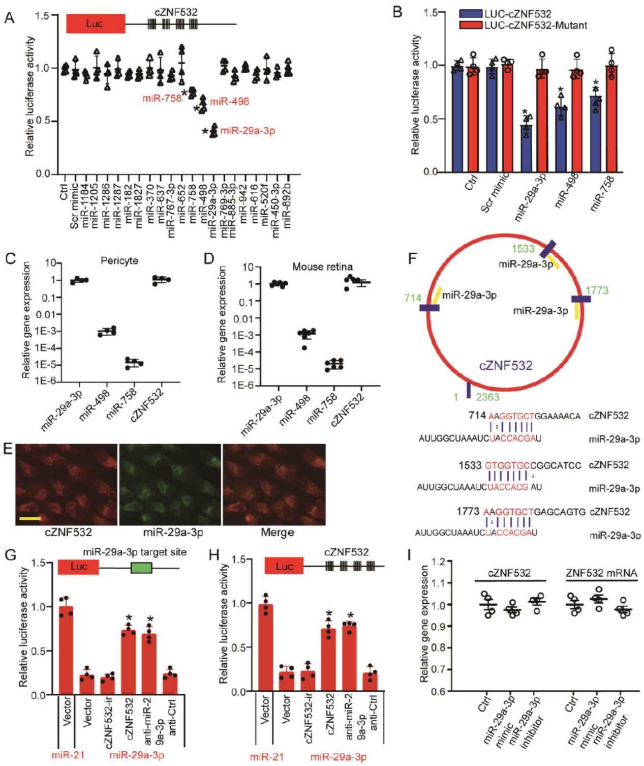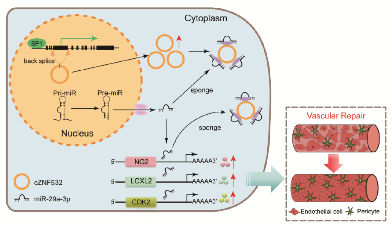 本文发现糖尿病视网膜病变中cZNF532高表达,cZNF532可以通过竞争性结合miR-29a-3p,调控了NG2/LOXL2/CDK2等基因的表达,最终影响了视网膜周细胞覆盖度和血管通透性,在糖尿病视网膜病变过程中发挥作用。