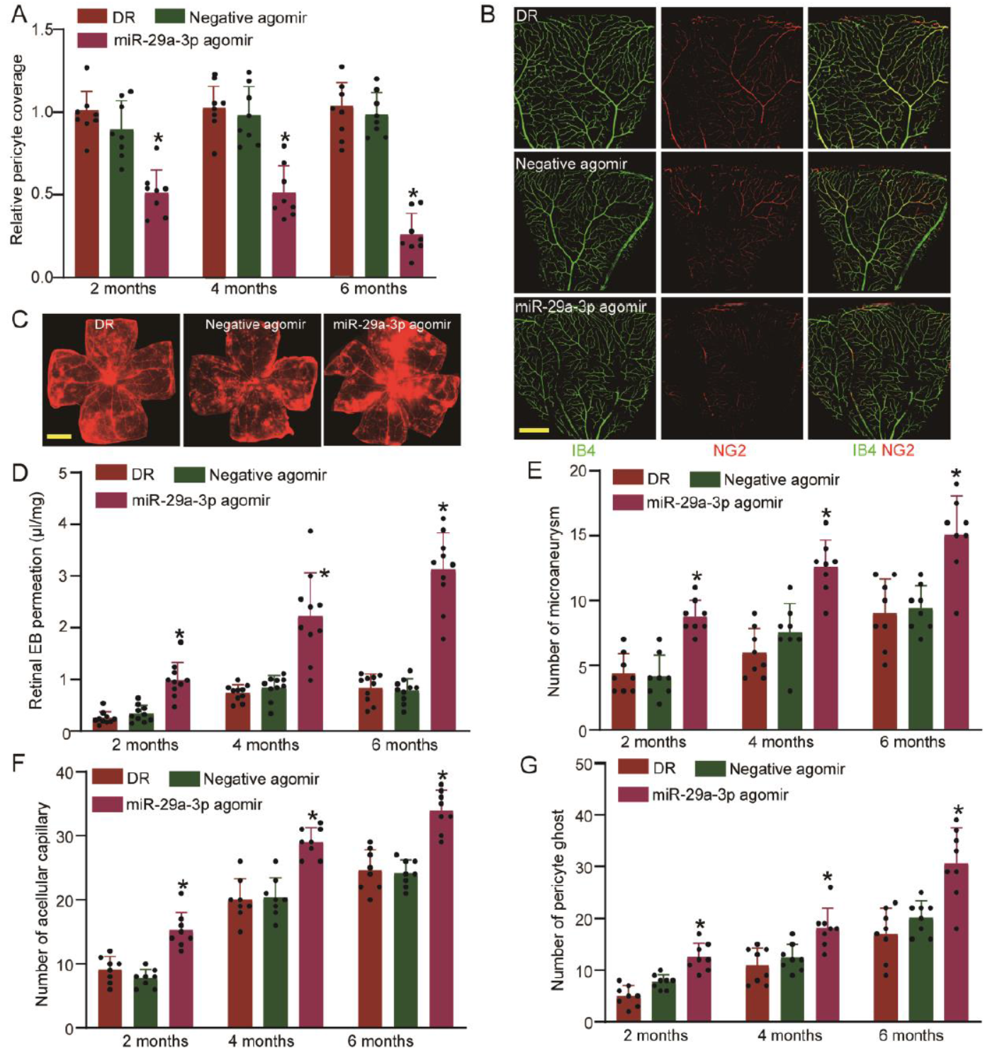 为证明cZNF532-miR-29a-3p-NG2/LOXL2/CDK2通路在糖尿病视网膜病变模型中与视网膜周细胞功能和血管完整性的关系。玻璃体内注射miR-29a-3p agomir或空载体和对照。结果表明注射miR-29a-3p agomir可显著降低血管周细胞的覆盖度和血管完整性,证明了这一通路在体内也是存在的。
