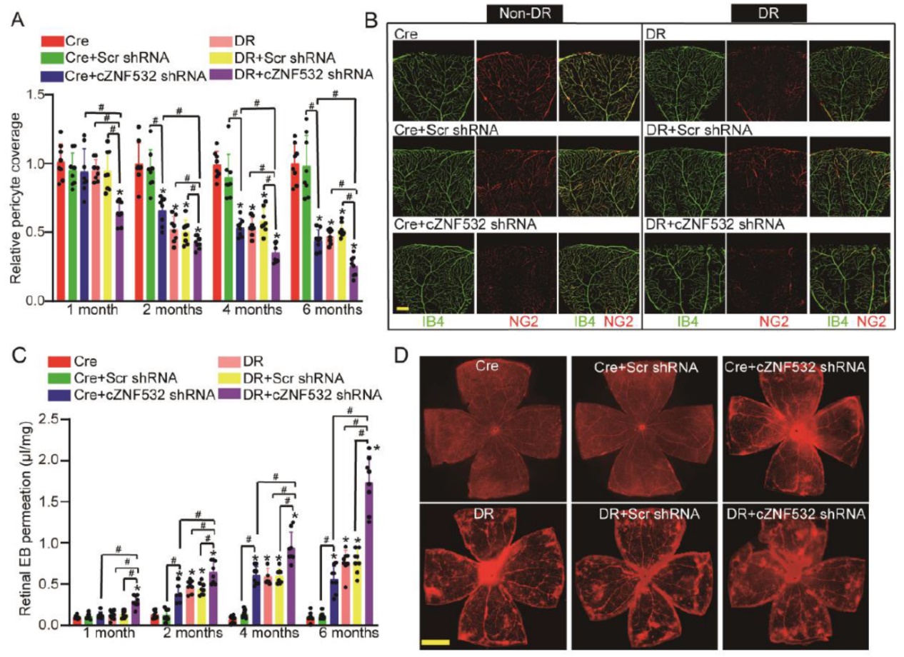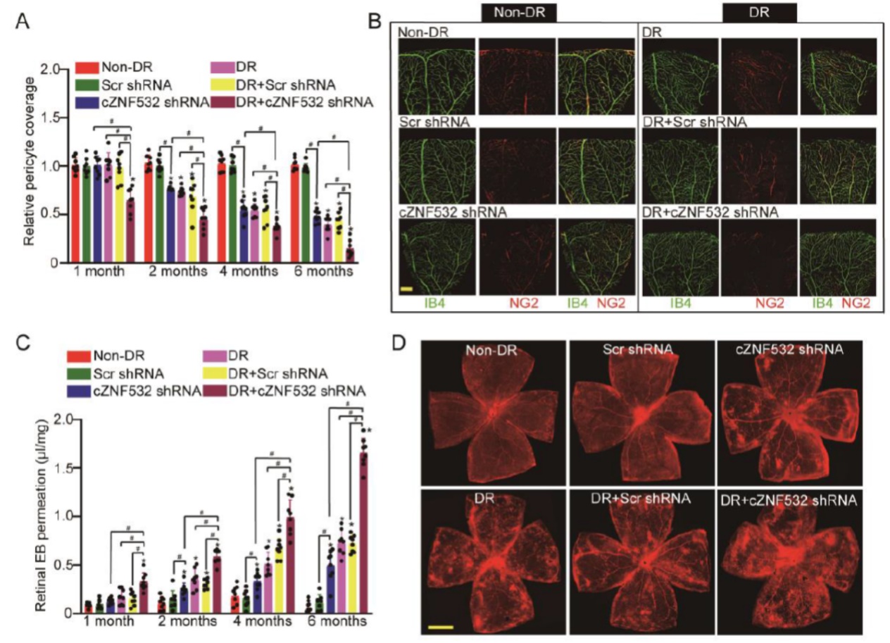 糖尿病模型中通过玻璃体注射cZNF532的shRNA载体能够显著抑制cZNF532的表达,IB4和NG2染色可检测视网膜血管周细胞覆盖的程度。结果表明在第一个月的时间点,单独的糖尿病模型组和单独干扰cZNF532组没有显著的周细胞覆盖度变化,但糖尿病组联合干扰cZNF532能显著降低血管周细胞的覆盖度。第二至第六个月,单独的糖尿病模型组和单独干扰cZNF532组没有也呈现出周细胞覆盖度的显著变化,两者组合后血管覆盖度差异更明显。Evans blue染色检测视网膜通透性,结果表明干扰cZNF532可显著增加血管的通透性。
