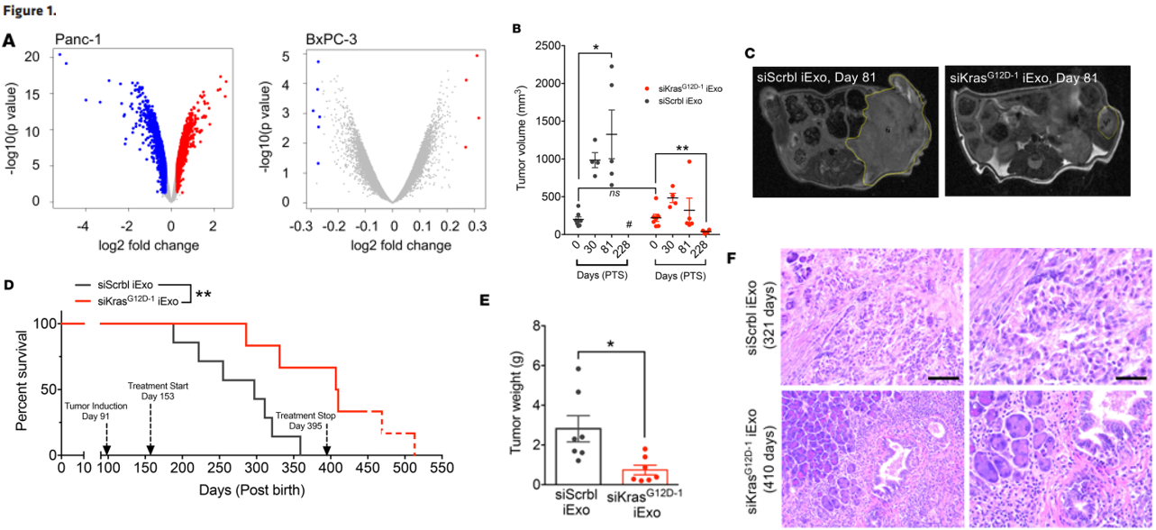 - 携带靶向致癌基因KrasG12D的外泌体(iExosomes)可以抑制病人来源PDAC异体移植物生长。(治疗模拟人胰腺癌的体内治疗)