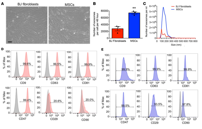 (A)人包皮成纤维细胞和人MSCs细胞的显微镜形态;(B)两种细胞外泌体的颗粒数目比较;(C)颗粒直径大小分布;流式检测两种细胞外泌体表面的分子,(D)人包皮成纤维细胞的流式结果,(E)人MSCs细胞的流式结果