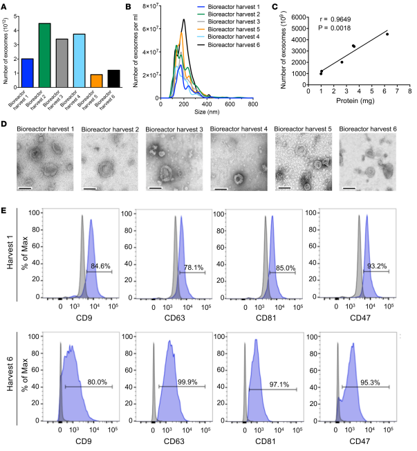 ②大量制备GMP级别MSC来源外泌体:这里,作者采用Terumo BCT牌的大量生物反应器培养系统,用1L 1×PBS进行预处理(自动化处理),并用稀释在250ml 1×PBS中的5mg人纤连蛋白(BD Biosciences)包被24小时。然后,用500ml 含有1% L-谷氨酰胺和5%人血小板裂解物的α-MEM(完全培养基)洗涤反应器并加入用25ml完全培养基稀释的20×106个MSC(第3代),并使用完全培养基扩增9天。将新鲜的完全培养基连续添加到细胞中,并根据每日葡萄糖和乳酸含量调整入口速率。 9天后通过葡萄糖和乳糖测量所确定的细胞达到约80%,用2L 1×PBS洗涤细胞,用不含PLT的培养基(补充有1%L-谷氨酰胺的αMEM)代替完全培养基。然后每隔48小时在密封袋(密闭系统)中收集生物反应器条件培养基(250ml),共6次收集(收获)。在这12天里,每日测量恒定的葡萄糖水平表示细胞没有出现问题。6次收集到的培养上清经过滤和超离后获得6种外泌体,经电镜鉴定、NTA分析直径大小和数目、流式检测外泌体表面分子,都没出现明显的批次质量差异问题。