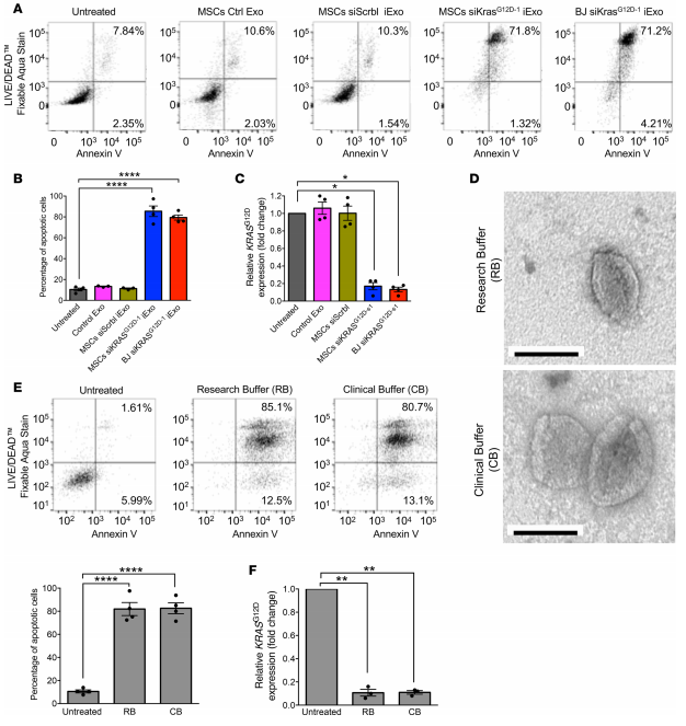 ③外泌体的体外功能验证:GMP级别的MSC细胞和BJ成纤维细胞外泌体经电转siKRASG12D后,获得MSC siKrasG12D–1 iExo和BJ siKrasG12D–1 iExo,两种外泌体在促进Panc-1细胞凋亡(A, B)和下调癌细胞KrasG12D基因表达(C)方面有相似的作用。作者之前研究中使用研究型buffer(RB)不适用于临床回输测试,所以采用临床型buffer(CB)稀释siKrasG12D–1 iExo,在该buffer下它的电镜形态(D),促进Panc-1细胞凋亡能力(E)和下调癌细胞KrasG12D基因表达能力(F)都没有受到影响。所以临床应用可以采用Plasma-Lyte (CB) buffer,可以获得最好的治疗效果,减少副作用。