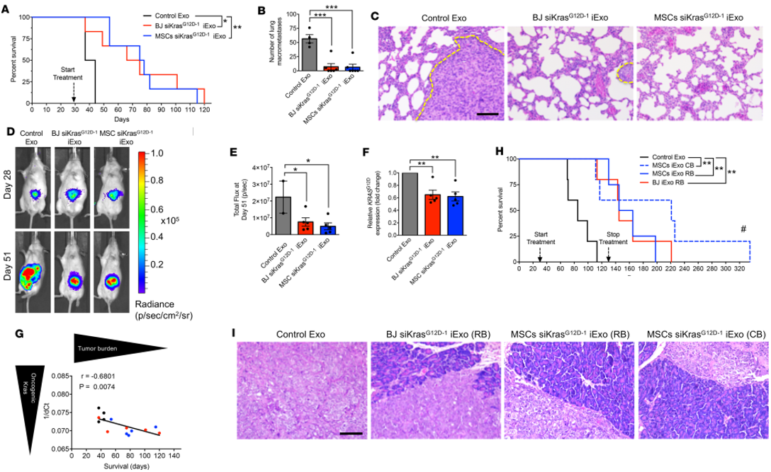 作者利用高转移性KPC689细胞构建原位癌模型[2],验证RB buffer稀释的MSC siKrasG12D–1 iExo和BJ siKrasG12D–1 iExo在第29天开始体内治疗效果,iExosome显著提高PDAC小鼠的总生存率(A),减轻癌转移负担(B),肺转移减少(C),IVIS成像观察iExosome治疗组在不同天数后肿瘤大小(D, E)和肿瘤Kras突变基因表达减少(F),致癌基因Kras表达和小鼠的生存率成负相关(G)。另外,作为采用了Panc-1细胞原位癌模型,给予iExosome治疗,MSC siKrasG12D–1 iExo和BJ siKrasG12D–1 iExo治疗无论用RB还是CB稀释都可以显著提高了小鼠的总生存率(H),改善胰腺的病理症状(I)。