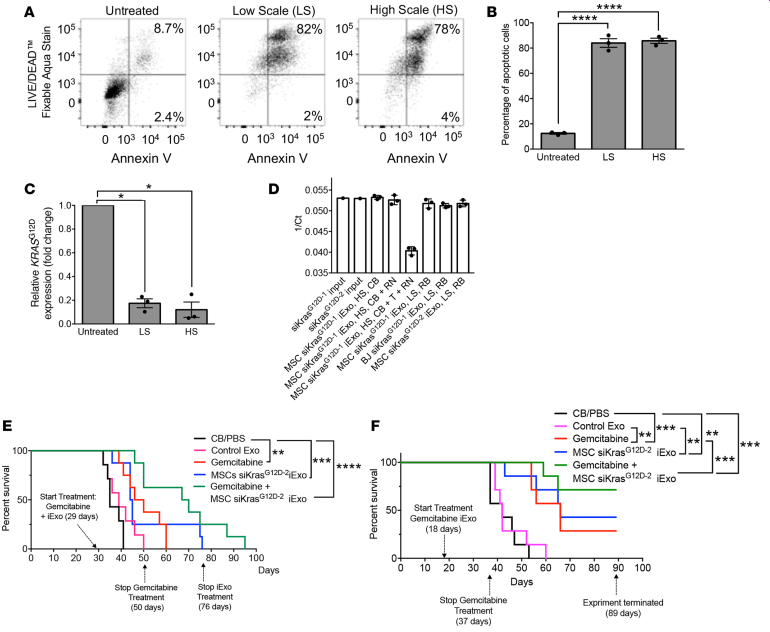 4. 制备大量的GMP级别iExosome可用于PDAC治疗研究。之前的是小规模电转siRNA(LS: 109外泌体+1ug siRNA+400RB),现在成比例放大的大规模电转siRNA(HS: 2*109外泌体+2mg siRNA(两个公司来源相同序列)+20ml CB),两种方法电转获得的MSC siKrasG12D–1 iExo都可有效促进Panc-1的凋亡(A, B)和抑制KrasG12D基因表达(C),但是外泌体这个效应会受到Triton X-100处理影响(D)。采用晚期KPC689癌细胞原位癌模型证明了MSC siKrasG12D–1 iExo和吉西他滨(临床治疗PDAC标准化疗药)联合治疗能提高成瘤小鼠的生存率(E),而且提前11天iExo和吉西他滨联合治疗更能显著提高成瘤小鼠的生存率(F)。