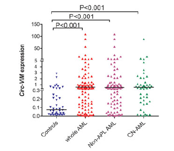 - 相比于42名正常健康人,全组112名AML病人的骨髓单核细胞BMNCs的Circ-VIM平均表达水平明显增高,特别是在患有非急性早幼粒细胞白血病(Non-APL)和细胞遗传学正常的CN-AML患者中。