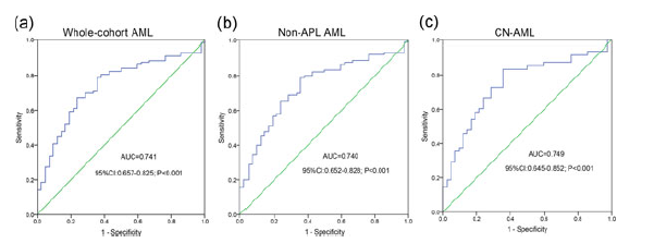 - ROC曲线分析说明Circ-VIM表达水平可用于从健康人群中区分出全组AML病人,而且也可以很明显地区分出Non-APL和CN-AML患者,提示Circ-VIM可作为诊断AML的理想生物标志物。