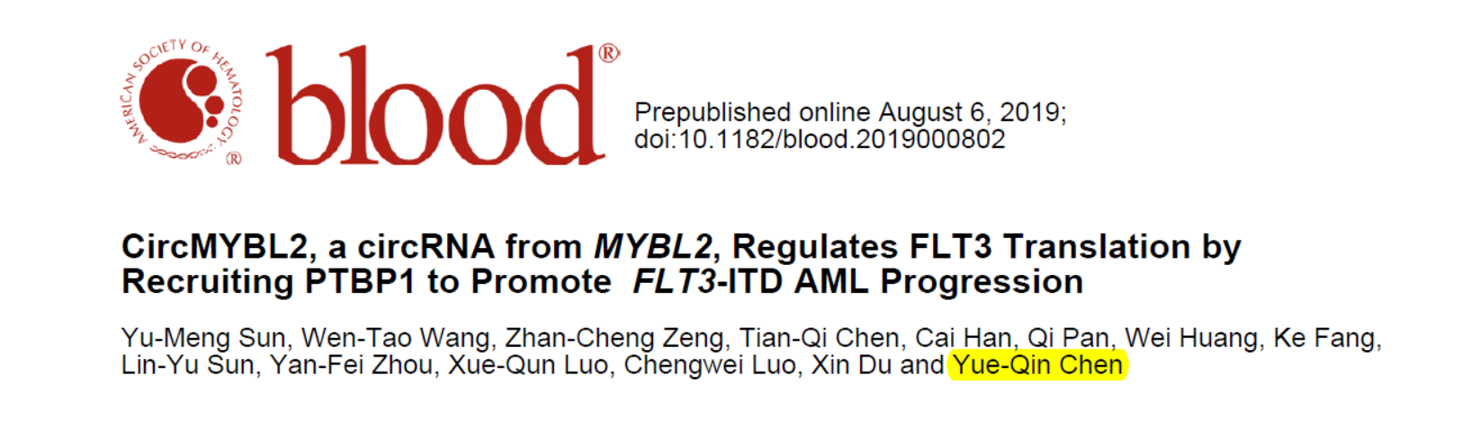 8月18日,血液学顶级杂志Blood发表了一篇circRNA的研究论文,报道在FLT3-ITD型急性髓系白血病(AML)中circMYBL2通过结合PTBP1促进FLT3蛋白翻译。文章的通讯作者是中山大学的陈月琴教授[1]。