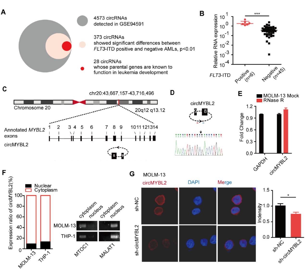 作者通过GEO数据分析了FLT3-ITD阳性和阴性的AML病人数据,发现了373种差异表达的circRNA分子,其中有28种分子的来源基因是已报道的与AML疾病发生发展有关的,其中便包括circMYBL2。circMYBL2来源于MYBL2基因的8-9外显子,QPCR表明circMYBL2在FLT3-ITD阳性病人中表达量显著高于阴性的患者,大约高出5倍左右。circMYBL2主要定位于胞浆,可耐受RNase R消化。