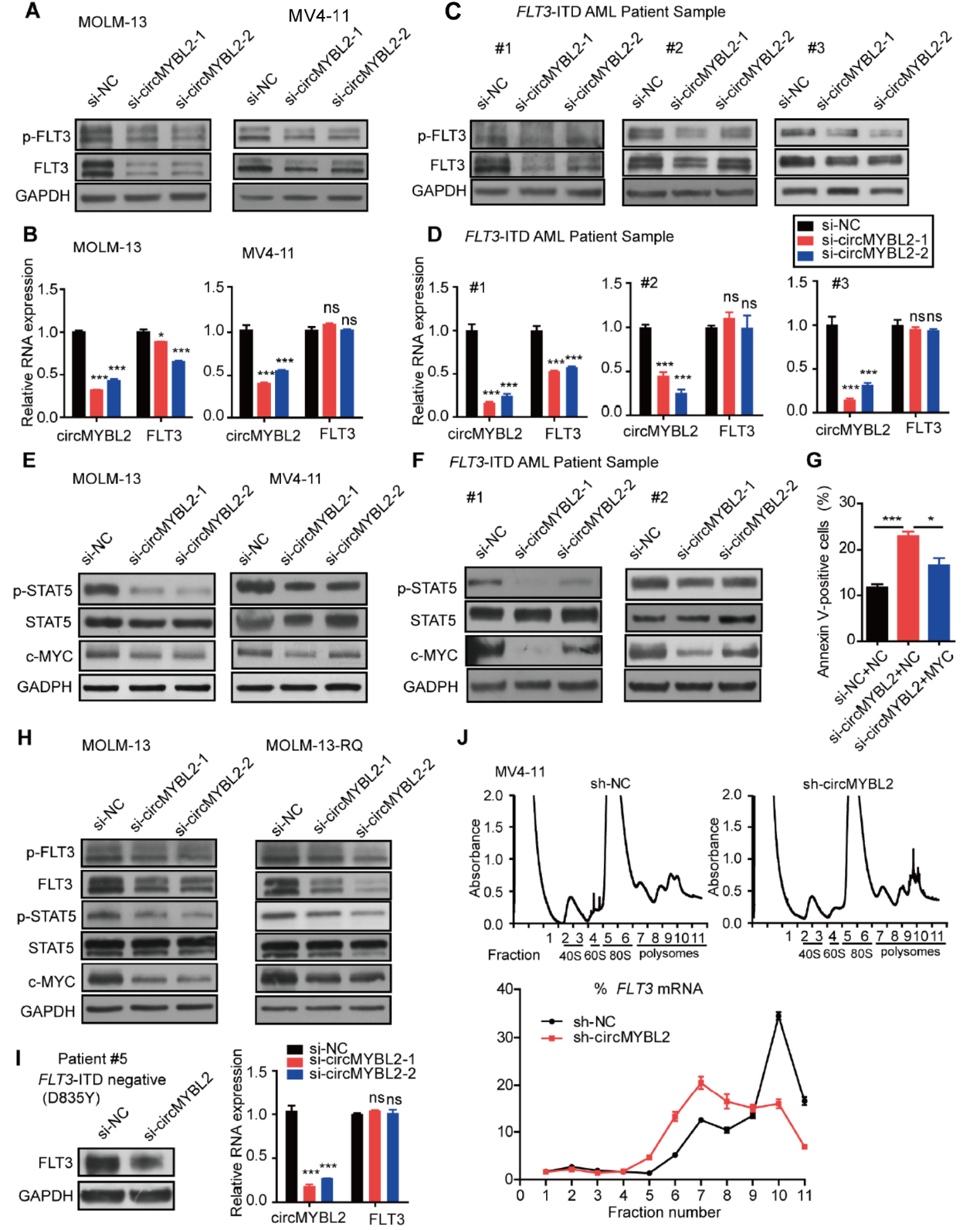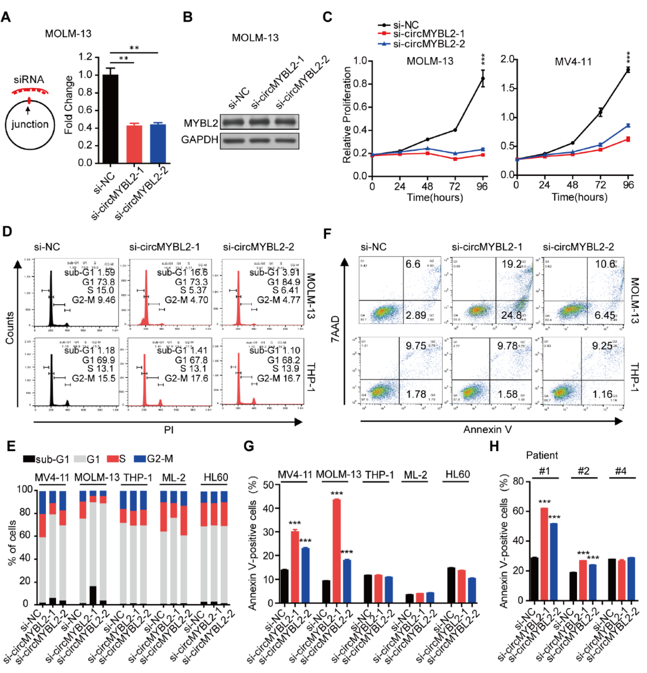 为分析circMYBL2在FLT3-ITD阳性和阴性细胞中的功能,作者设计了siRNA进行分析。所设计的siRNA仅能对circMYBL2起敲降作用,但对起来源基因MYBL2没有影响。circMYBL2敲降后对FLT3-ITD阳性的MOLM-13细胞和MV4-11细胞具有显著的抑制增殖功能,也可以促进其凋亡。但在FLT3-ITD阴性的THP-1,ML-2和HL60细胞中效应不明显。敲降circMYBL2也可显著抑制FLT3-ITD阳性患者AML细胞克隆形成,但对FLT3-ITD阴性的AML患者细胞克隆形成没有明显影响。说明circMYBL2仅在在FLT3-ITD阳性AML中特异性发挥作用。