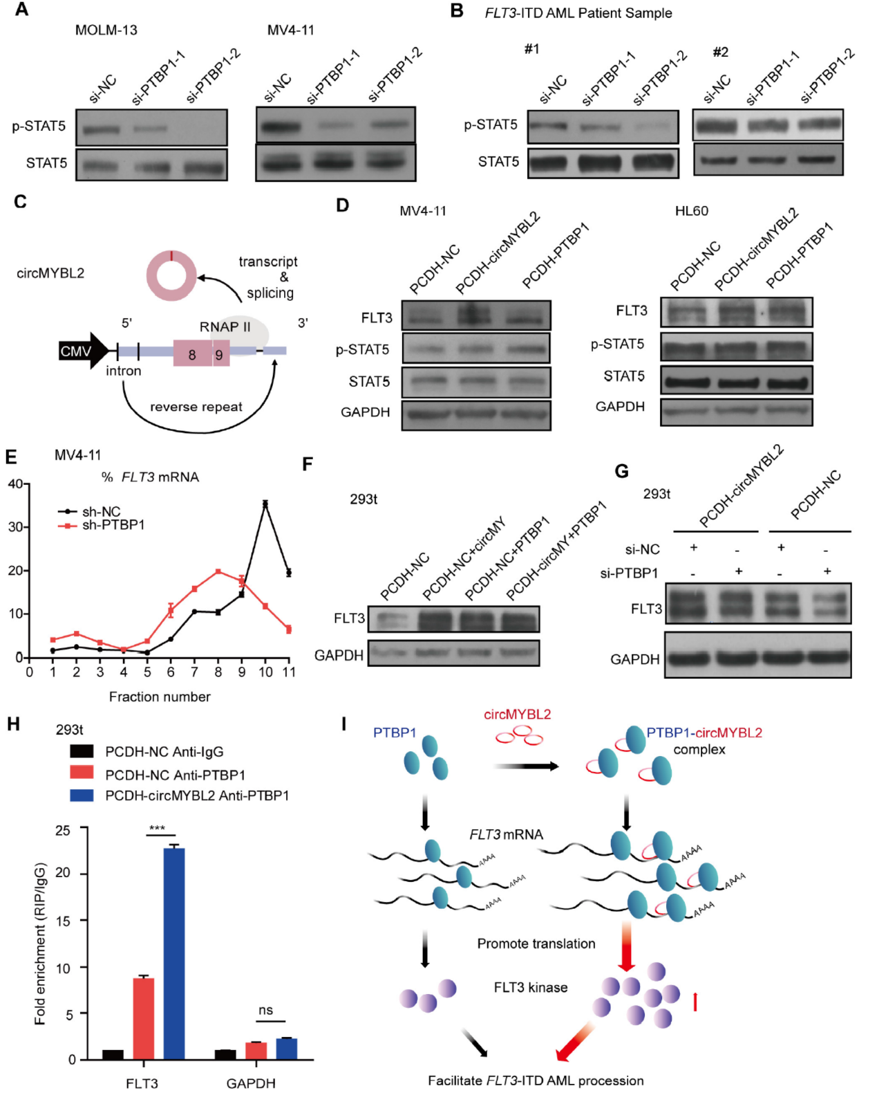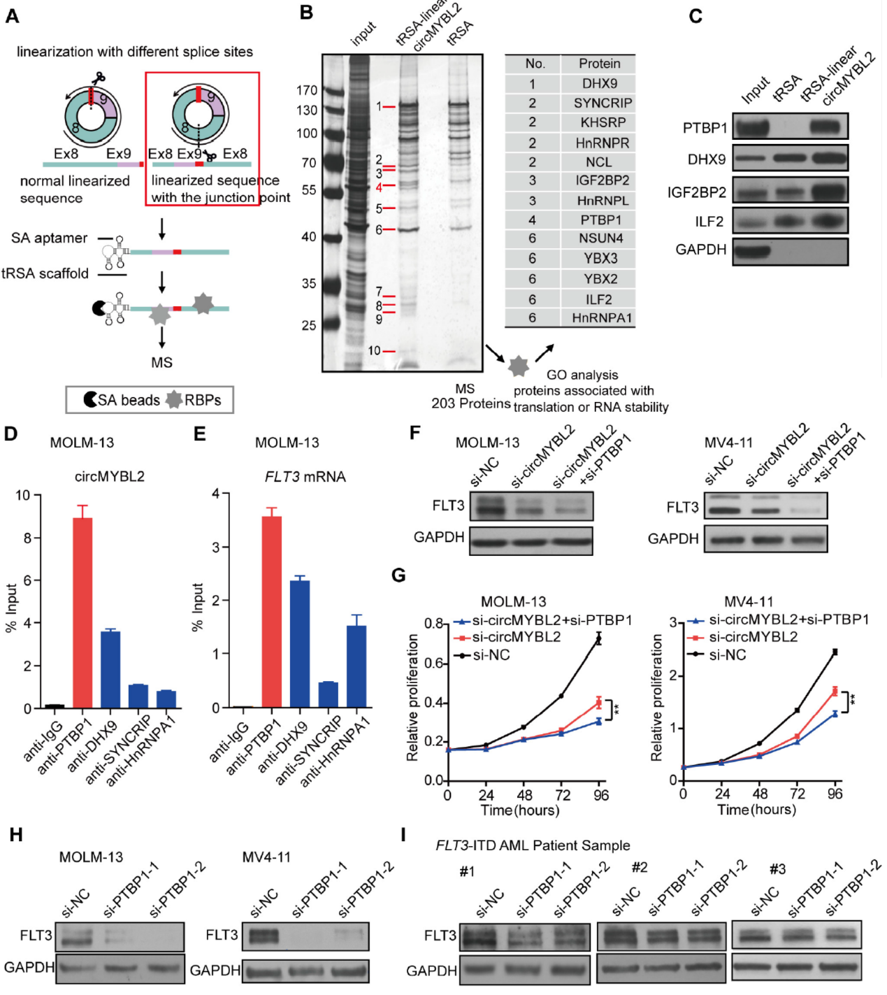 作者首先基于AGO2的CLIP数据分析,没有找到circMYBL2与AGO2相互做的证据,抗AGO2抗体的RIP实验也没有捕获circMYBL2,因此排除了circMYBL2作为miRNA竞争性结合分子的可能。为探索circMYBL2如何调控FLT3的翻译的,作者构建了circMYBL2拉直的过表达载体,在其一端添加了SA apatamer,通过SA Beads拉相互作用的蛋白,然后质谱分析。在这一体系中拉到的相互作用蛋白进行GO通路分析。作者共得到203种相互作用蛋白,其中有13种蛋白与蛋白翻译调控有关。其中PTBP1与circMYBL2的相互作用较强,进一步的WB验证也确认了circMYBL2与PTBP1的相互作用。不同的抗体进行RIP实验,也证明PTBP1是与circMYBL2和MYBL2 mRNA相互作用最强的分子。与干扰circMYBL2相似,干扰PTBP1也可以显著降低FLT3的蛋白水平和STAT5的磷酸化水平。