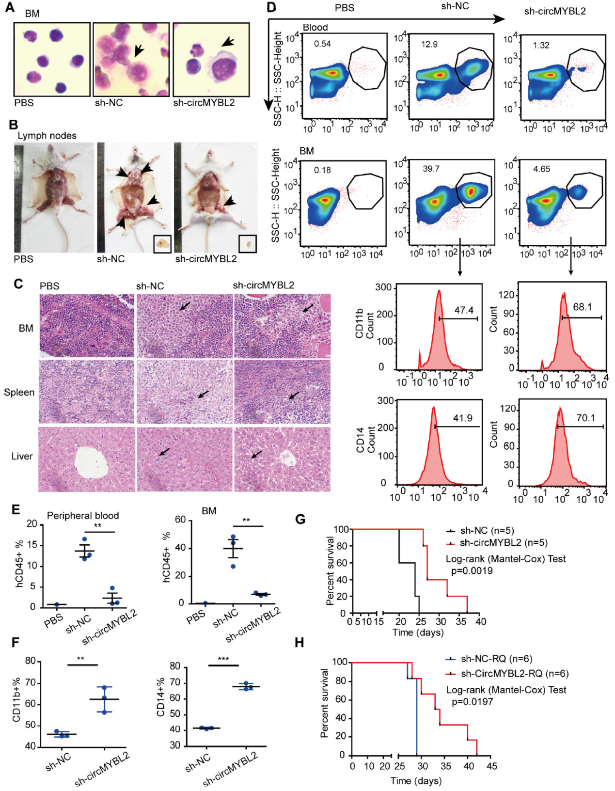NOD-SCID小鼠分别通过尾静脉注射不同shRNA载体稳定感染的MOLM-13细胞,包括sh-NC和sh-circMYBL2。三周后分析骨髓和淋巴结转移的情况。sh-circMYBL2组淋巴结中转移的细胞显著低于sh-NC组。组织中,骨髓,脾脏和肝脏中转移的细胞数也远少于sh-NC组。sh-circMYBL2组CD11b和CD14显著增加,说明干扰circMYBL2有助于细胞分化。sh-circMYBL2组生存时间远高于对照组。