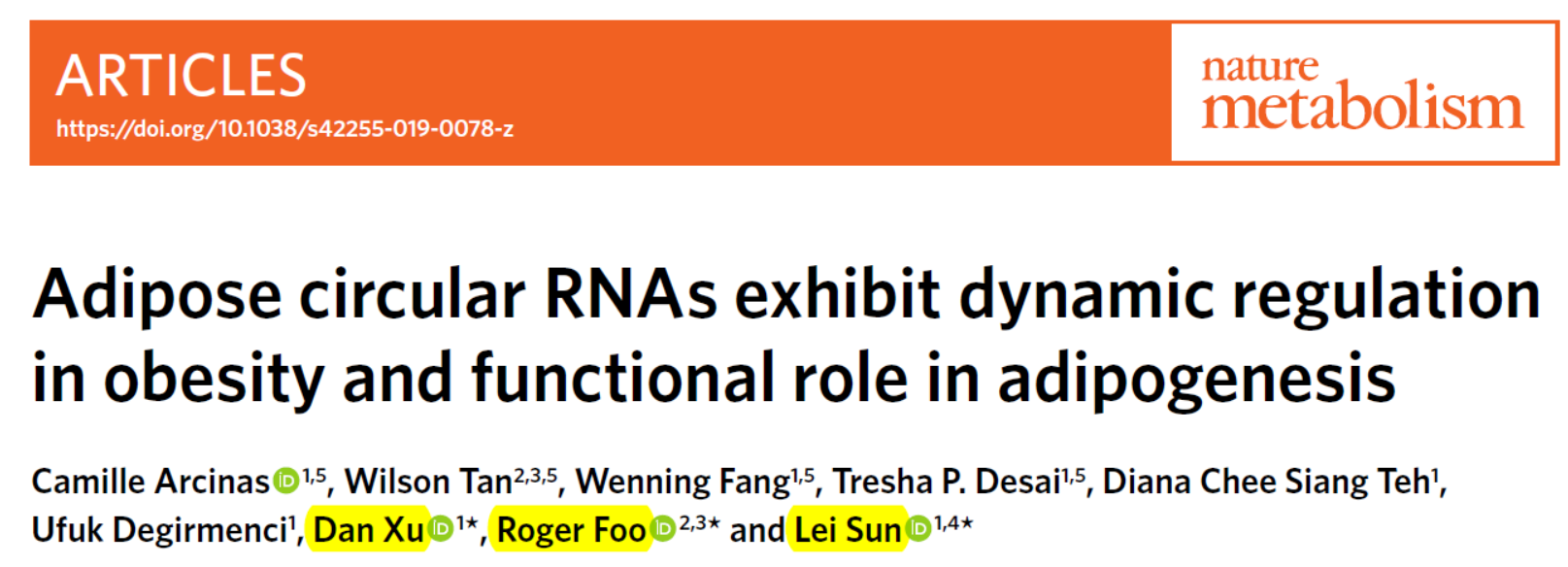 1. Camille Arcinas , W.T., Wenning Fang, Tresha P. Desai, Diana Chee Siang Teh, Ufuk Degirmenci, Dan Xu , Roger Foo and Lei Sun, Adipose circular RNAs exhibit dynamic regulation in obesity and functional role in adipogenesis. Nature Metabolism, 2019.