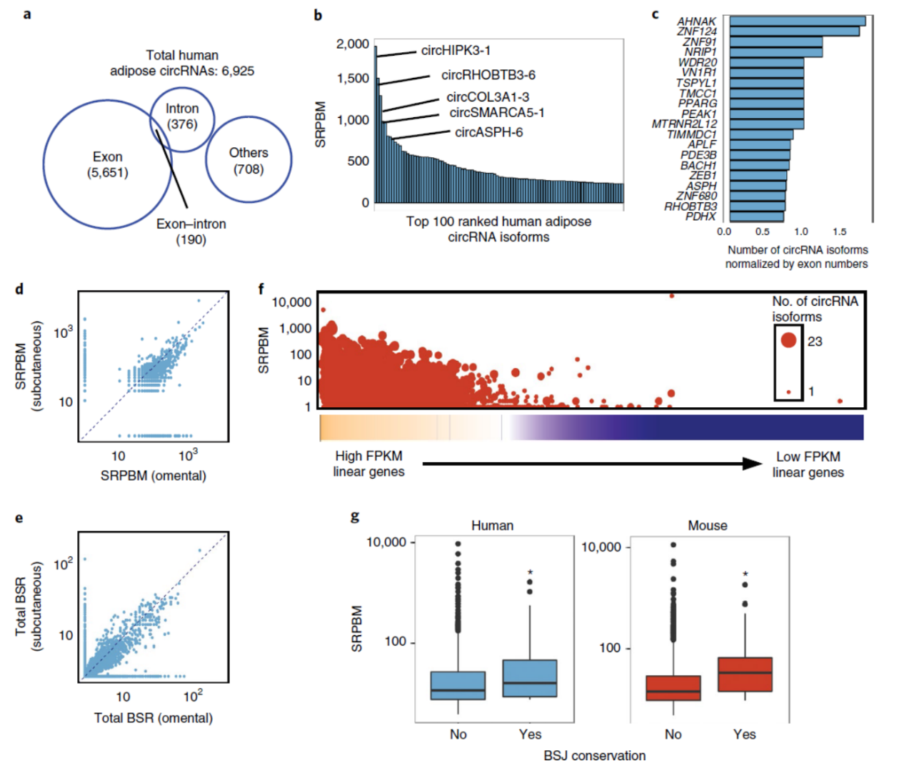 从人体内脏网膜和皮下脂肪组织及小鼠附睾和腹股沟脂肪组织中分离总RNA,去核糖体后测序。人体组织中共测得6925种circRNA,小鼠测得2380种。