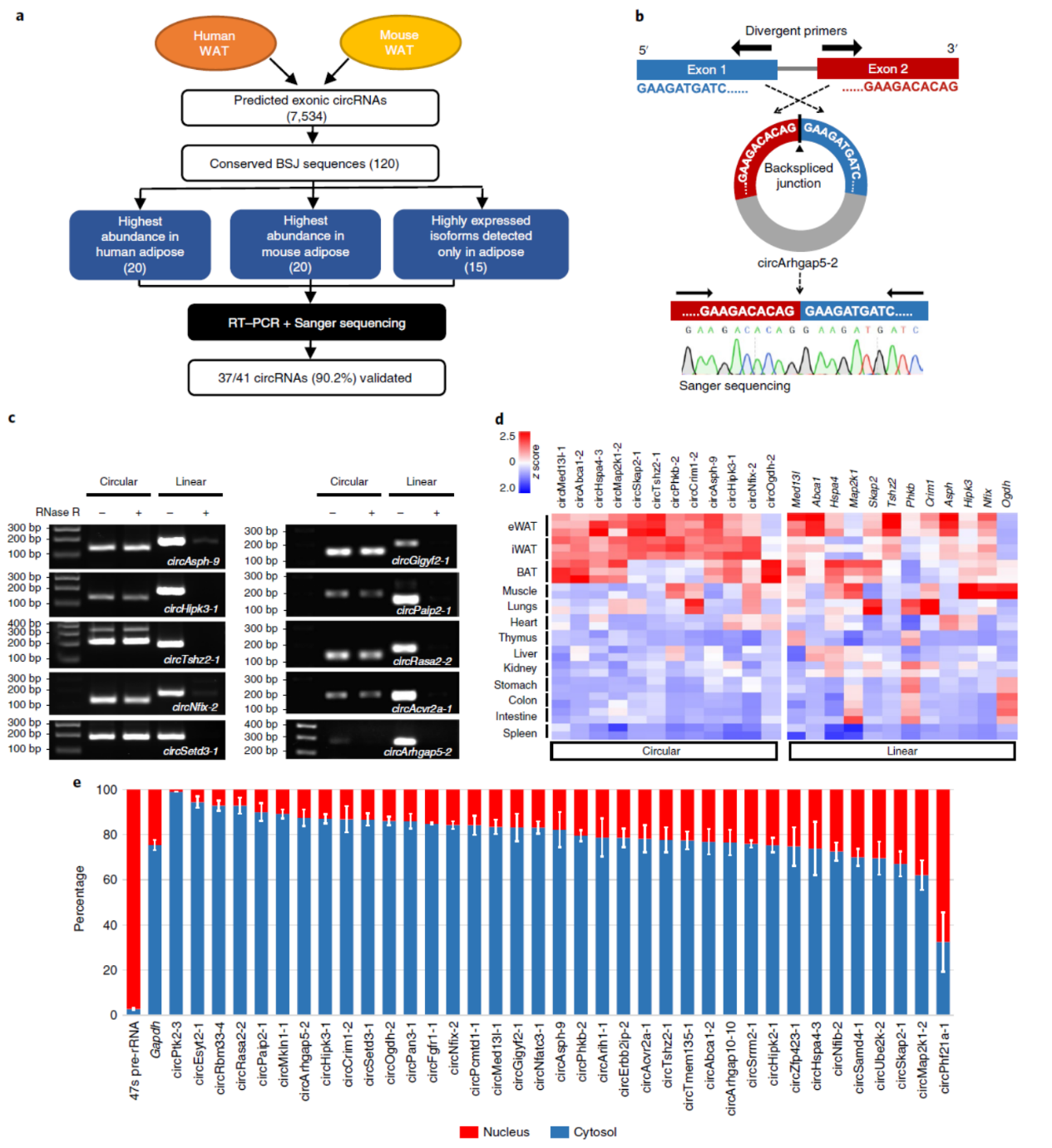 人和小鼠获得的数据进行比对分析,共有120种circRNA是人与小鼠均存在的保守分子。选择人或小鼠脂肪组织中表达丰度最高的各20个,脂肪组织特异性的circRNA分子15个,去除总长度小于90bp的,最终剩余41种circRNA分子进行QPCR和Sanger测序验证。其中37种可以得到验证确认。作者进一步选取了12种circRNA分子在小鼠不同的组织中QPCR分析了它们和对应线性mRNA的表达情况,结果显示这12种circRNA均呈现出较高的脂肪组织特异性的表达特征,但它们对应的线性RNA的组织特异性稍弱。作者还通过分离胞质与核组分,分析了所选取的circRNA分子在胞质与核中的分布情况。