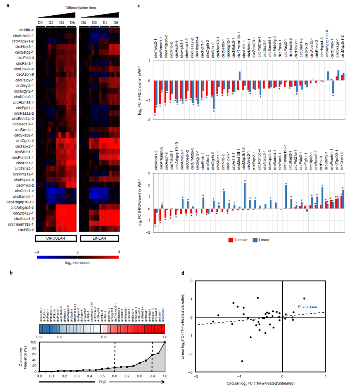 为分析这些circRNA分子是否参与脂肪组织的生成,作者选择脂肪前体细胞体外分化体系进行验证。结果表明候选的circRNA分子中有31种circRNA会伴随着脂肪分化过程而显著升高。相关性分析表明所有这些circRNA分子的表达都与对应的线性RNA的表达状态相关。体内,高脂饮食处理后,脂肪组织中绝大部分circRNA呈现出下调变化趋势, 37个circRNA分子中有33个呈现下调,其中19种的变化是统计显著的。有趣的是,在腹股沟脂肪组织样本中,高脂饮食导致的circRNA和对应线性RNA的变化趋势呈现出有趣的变化状态,很多分子表现出相反趋势的变化。说明脂肪生成过程中circRNA的形成不完全是对应线性基因表达变化所导致的。过度肥胖往往导致单核细胞等进入脂肪组织,释放TNFα是等促炎症因子。因此作者分析了TNFα处理对circRNA和对应基因的影响情况,结果表明TNFα处理的确能诱导这些circRNA的下调,但其变化与对应线性RNA的变化并不一致,相关性不高。这些结果表明脂肪组织分化过程伴随着circRNA的变化,这些变化不完全由对应基因的转录变化所导致。