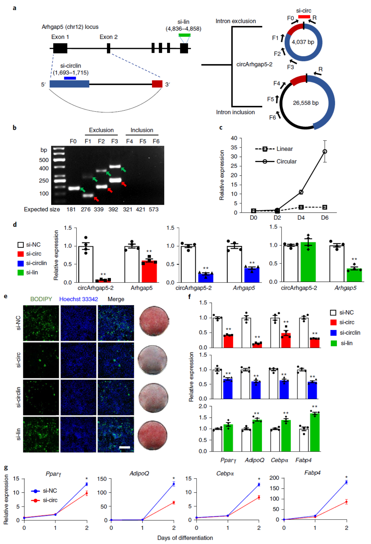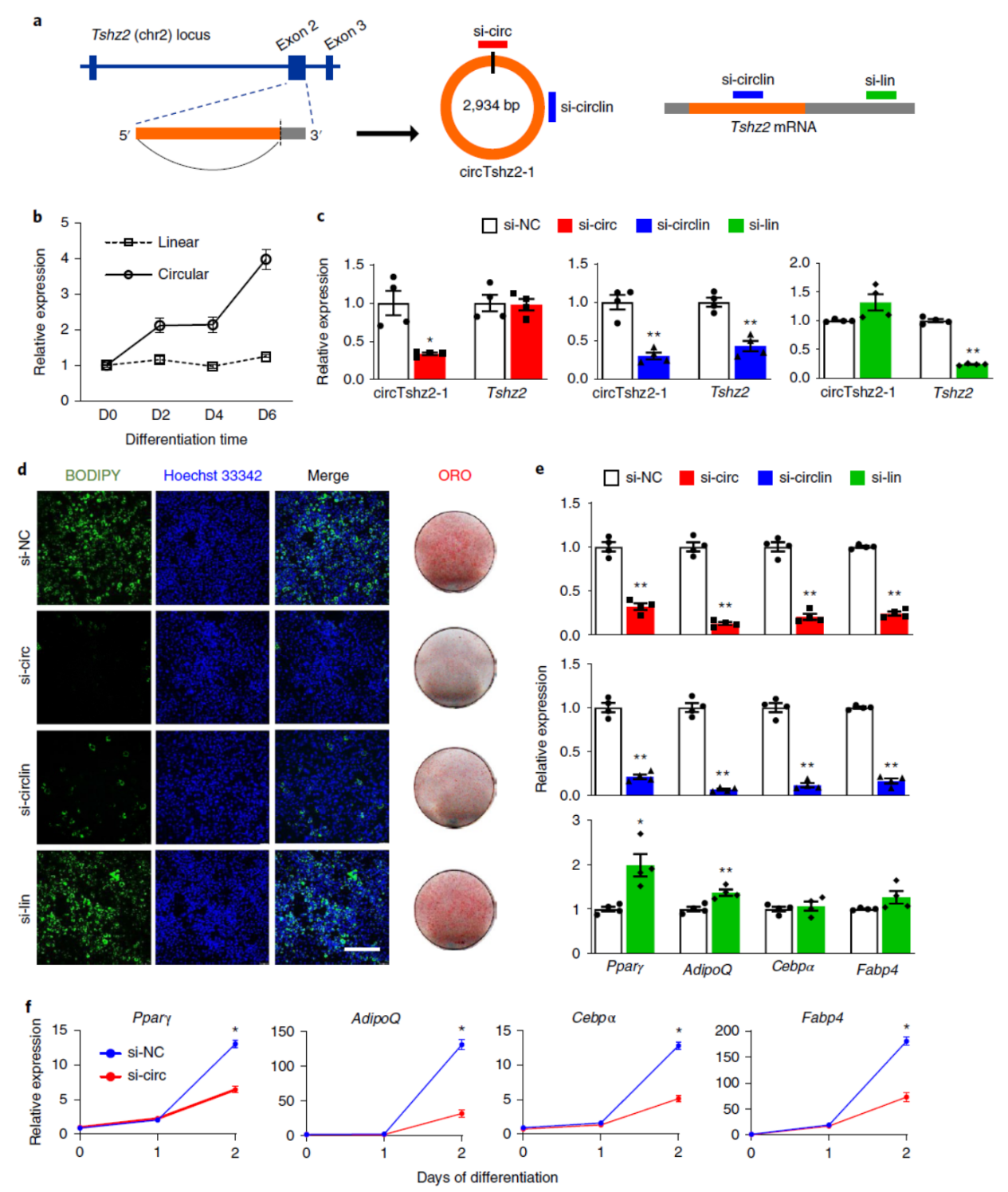 为分析circRNA是否参与脂肪分化过程,作者基于RNAi,分析了两个circRNA分子,circTshz2-1和circArhgap5-2,这两种circRNA分子对应的线性RNA在脂肪分化过程中变化并不明显,但两个circRNA分子都呈现显著的上调。针对circRNA和线性RNA分别设计siRNA,分析脂肪分化效率。结果表明,circTshz2-1干扰后都显著影响脂肪分化的效率,表现为脂滴数目下降,脂分化相关标志物基因下调。