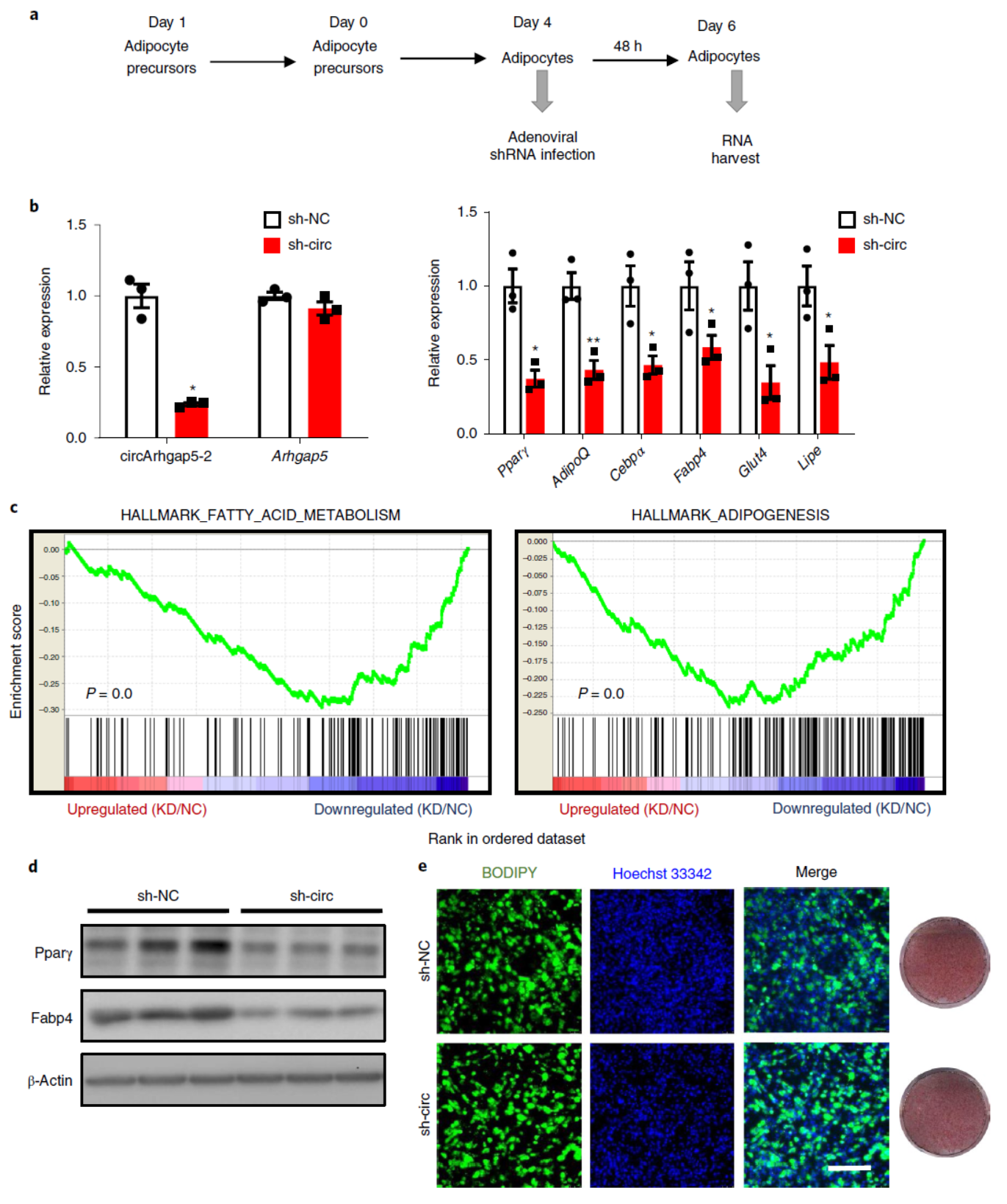脂肪分化过程中将circArhgap5-2干扰后分析转录组表达变化,GSEA分析表明脂肪代谢和脂分化相关的基因存在显著下调,说明干扰circArhgap5-2后显著影响了这两个通路相关的基因的表达。