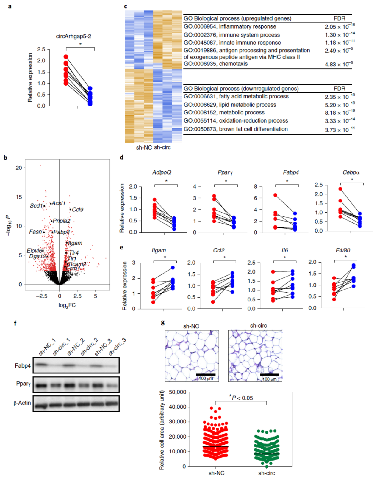 小鼠体内注射circArhgap5-2的shRNA的AAV病毒,QPCR检测circArhgap5-2,测序分析转录组变化情况并进行通路富集分析。结果表明shRNA干扰circArhgap5-2后,脂代谢和脂肪分化相关的基因下调,但炎症相关的通路上调。QPCR检测脂分化相关基因的表达表明脂代谢标志物下调而炎症通路基因上调。