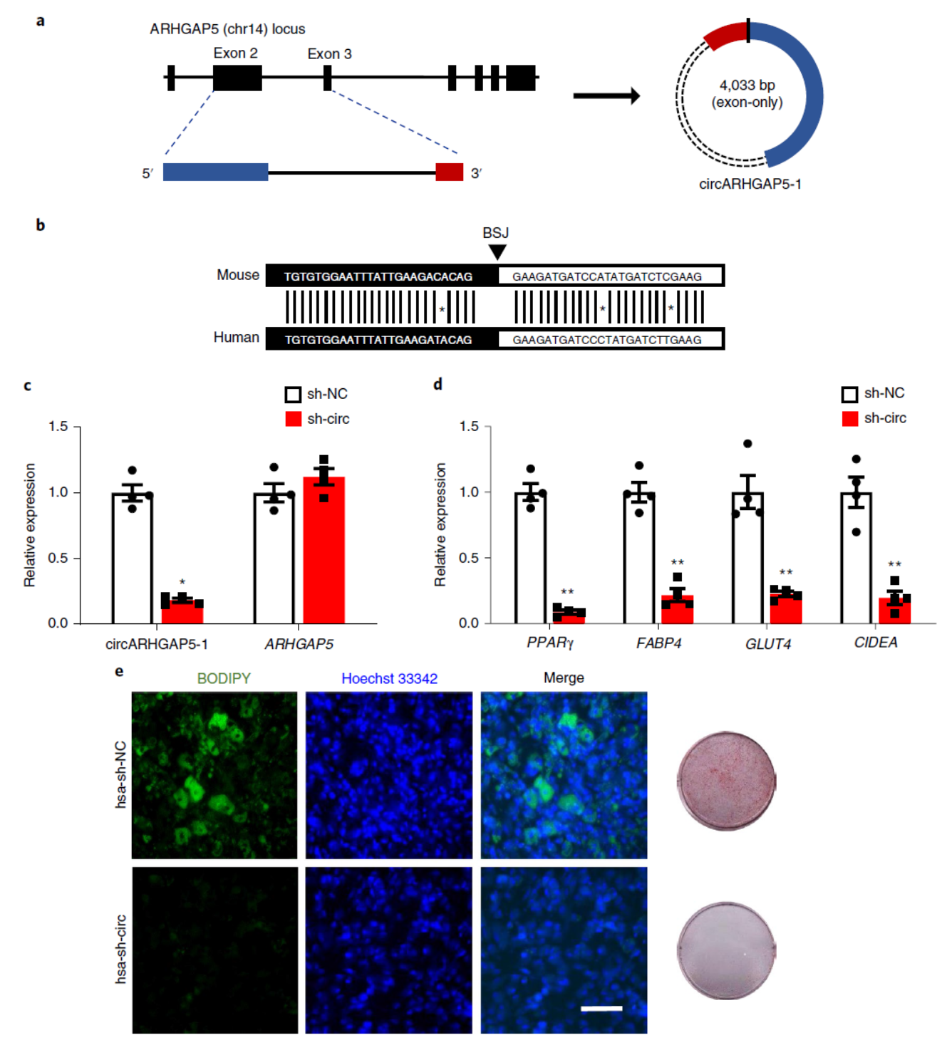 人类中与circArhgap5-2同源的是circARHGAP5-1分子,脂肪细胞中干扰circARHGAP5-1也可以导致脂分化相关的标志物基因下调,抑制脂滴的聚集。