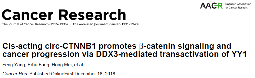 最近华中科技大学同济医学院附属协和医院的童强松研究团队于Cancer Research上在线发表了题为Cis-acting circ-CTNNB1 promotes β-catenin signaling and cancer progression via DDX3-mediated transactivation of YY1的研究,发现编码β-catenin蛋白的ctnnb1基因来源的circ-CTNNB1结合DDX3,促进其与转录因子YY1的相互作用,从而导致YY1的反式活化,以及促进下游与β-catenin活化和肿瘤发展有关的基因表达。敲低circ-CTNNB1表达或者应用阻断circ-CTNNB1-DDX3相互结合的抑制肽可以明显地抑制致癌基因的表达和肿瘤的发生发展,这首次揭示了circ-CTNNB1的致癌作用以及其可能作为未来肿瘤治疗的有效靶点。
