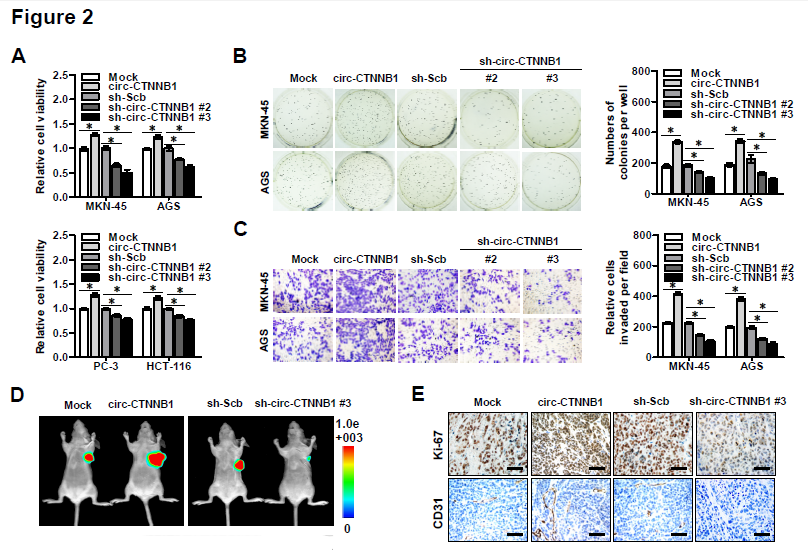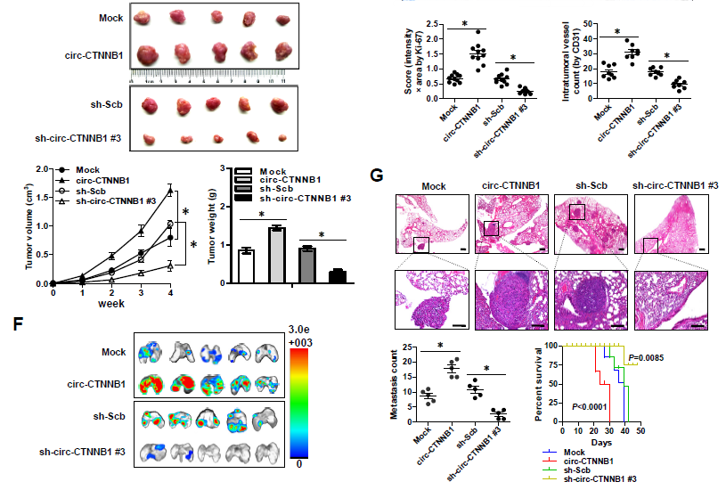 2. circ-CTNNB1的gain or loss of function实验——体外实验验证:接着作者分别在不同类型肿瘤细胞株中过表达或者敲低circ-CTNNB1后,发现其可以分别促进或者抑制细胞存活能力、克隆形成能力和侵袭能力;体内实验验证:过表达或者敲低circ-CTNNB1的癌细胞相应地,在体内成瘤能力增强或者降低,瘤子体积明显增大或者减小,Ki67增殖指数变大或者变小,CD31阳性瘤内微血管形成能力增强或者减弱;在体内尾静脉注射癌细胞后观察肺转移的实验中,过表达或者敲低circ-CTNNB1可以明显促进或者抑制其发生肺转移,导致相应的降低或者提高小鼠存活率的情况。(PS: 本文的circ-CTNNB1过表达载体采用的是吉赛生物的pLCDH-ciR 载体,可转染细胞瞬时表达,也可包装慢病毒构建稳定细胞系,同时表达GFP荧光和 Puromycin抗性基因,可以方便地进行筛选,同时具有过表达效率高、稳定性高和序列环化准确等特点。)