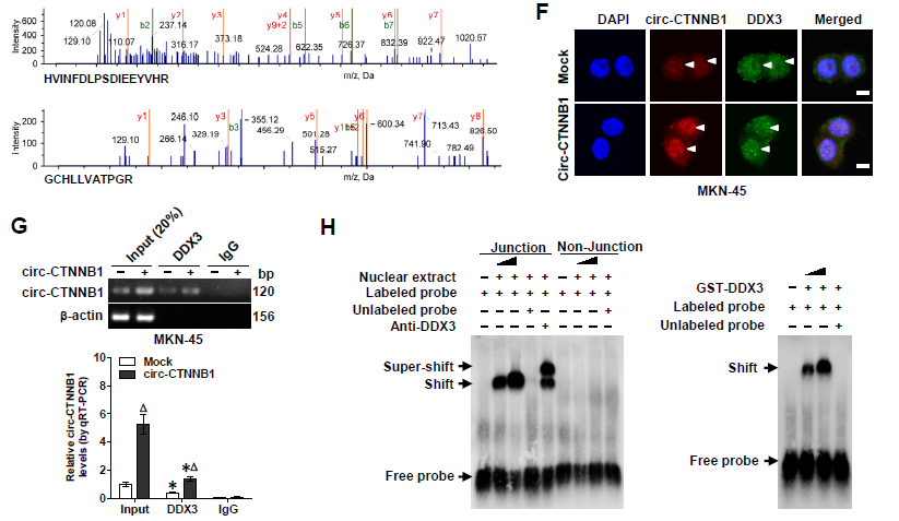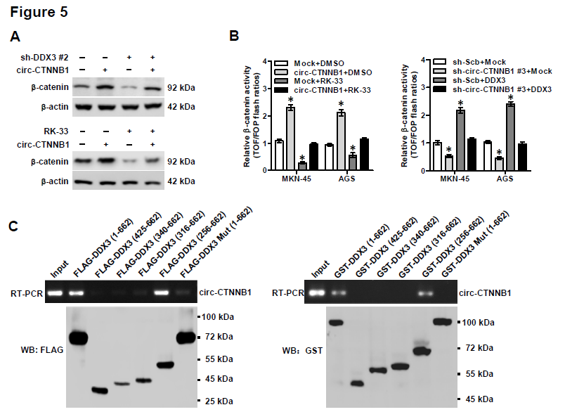 4. circ-CTNNB1发挥功能需要借助什么蛋白partners?RNA-FISH和亚细胞组份分析证明circ-CTNNB1主要定位于胞核中,借助特异性biotin标记的circ-CTNNB1进行RNA pull-down蛋白复合物后再质谱分析蛋白的实验,结合两种细胞株的结果和RBPs数据库筛选出了三种RBPs蛋白,体外再次利用biotin标记的RNA pull-down实验进行二次验证,发现只有DDX3可以与circ-CTNNB1结合,并呈现剂量依赖性;同样地,RNA-FISH、RIP和RNA-EMSA实验均证明了circ-CTNNB1与DDX3相互结合。