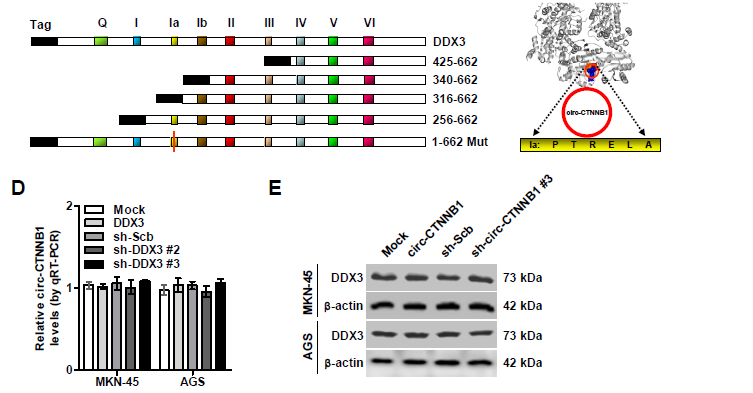5. circ-CTNNB1与DDX3相互结合是否可以调控β-catenin的表达和活性?过表达circ-CTNNB1促进β-catenin蛋白表达的效应,会被DDX3敲低或者DDX3抑制剂RK-33部分抵消。同样地,过表达或者敲低circ-CTNNB1表达促进或者抑制β-catenin活性的效应,也会被RK-33处理或者DDX3过表达所部分抵消。构建不同截短体的DDX3进行体外结合试验,证明了DDX3蛋白的256-315氨基酸(主要是Ia区域的274-279aa)对于circ-CTNNB1的结合是至关重要的。有趣的是,circ-CTNNB1与DDX3两者的表达并不会相互影响。
