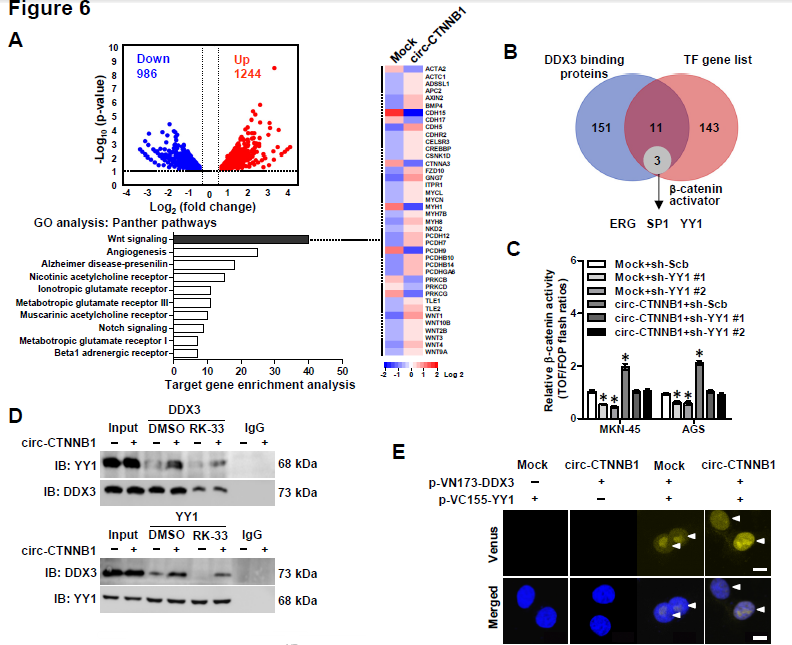 6. 下一步作者继续深入探究circ-CTNNB1的下游靶基因,通过circ-CTNNB1过表达后RNA-seq分析相关基因的变化,发现1244种基因出现上调,986种基因出现下调;GO分析发现差异表达的基因大部分与Wnt信号通路相关,包括WNT1, WNT3,AXIN2, FZD10和BMP4这五种基因。通过图6B的方法筛选出共同调控这些与Wnt信号通路基因的转录因子,主要是ERG、SP1和YY1。作者发现只有敲低YY1的表达才可以抑制circ-CTNNB1诱导上调的β-catenin表达。Co-IP和BiFC实验均证明了DDX3与YY1相互结合,而且circ-CTNNB1过表达促进,而RK-33处理抑制两者的相互结合。双荧光素酶报告基因实验证明了circ-CTNNB1和DDX3表达对于促进YY1转录活性的重要性,也证明了circ-CTNNB1、DDX3和YY1表达对于促进Wnt信号通路相关的WNT1、WNT2、AXIN2, FZD10和BMP4基因的表达的重要性。