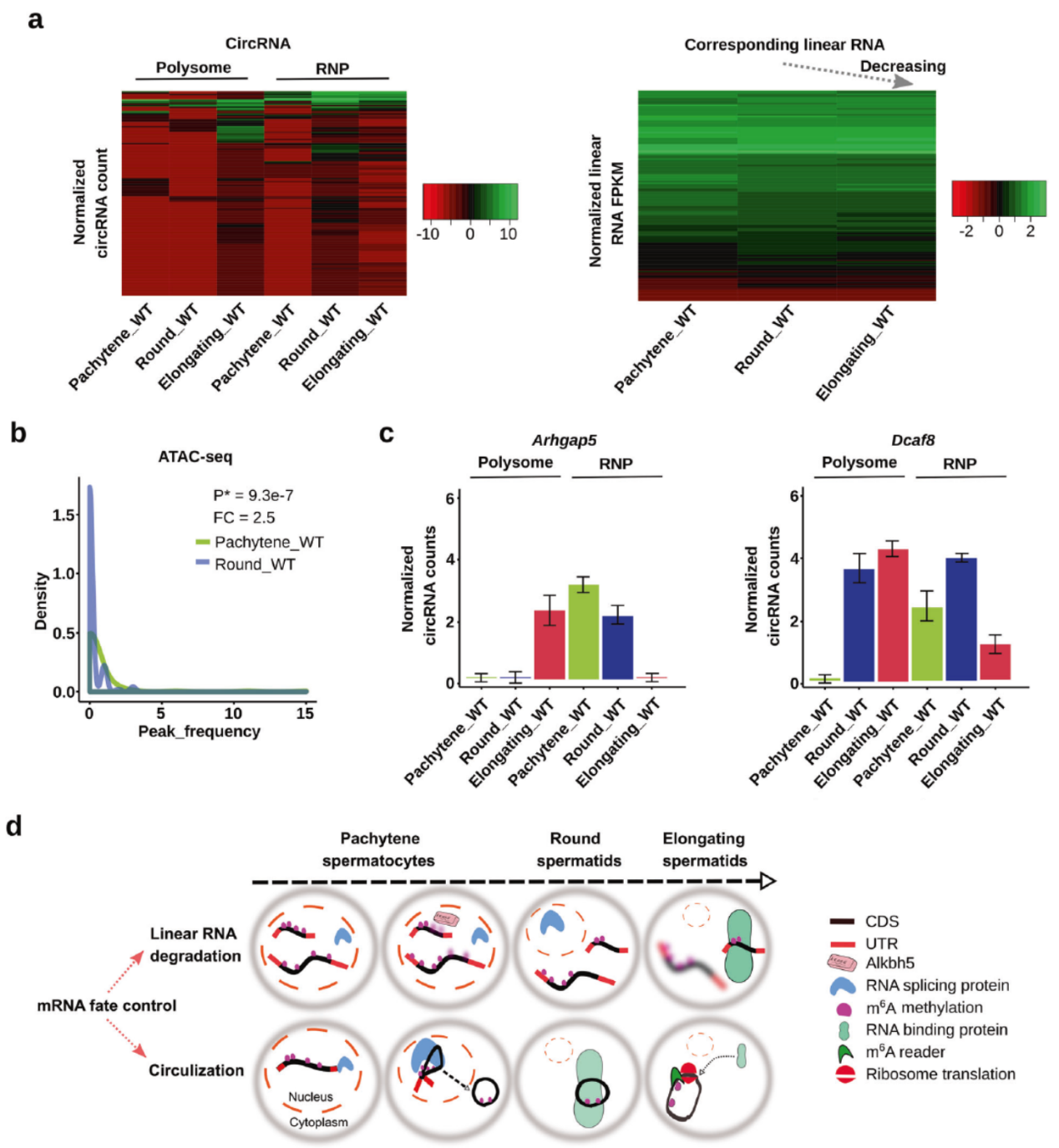 基于上述的发现,作者分析了精子发生的不同阶段circRNA结合在RNP中和结合核糖体的情况,结果显示随着精子发生的进展,更多的circRNA会从RNP颗粒中释放出来,结合核糖体,而它们所对应的线性RNA则逐渐被降解。ATAC-seq分析表明和粗线期相比,圆形细胞期的染色质松散性更低。