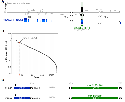 本文研究的是由SLC45A4的第一外显子产生的circRNA, circSLC45A4,该circRNA在人类和热带非洲爪蟾之间高度保守。在妊娠第22周时人类胚胎额叶皮层中鉴定所有的36,408个circRNA中,circSLC45A4的circRNA:mRNA比率(circRNA表达比mRNA高47倍)排名第六,表明circSLC45A4在神经发育中的重要作用。PhyloPscore评估发现,形成circSLC45A4的外显子比该基因的第8个外显子更保守。