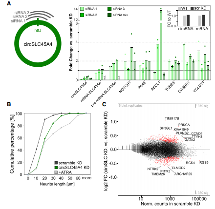 SH-SY5Y细胞是广泛用于研究神经元分化的人类细胞系。通过细胞分离实验,发现circSLC45A4主要定位于细胞质中,而mRNA存在于核和线粒体中。随后,作者使用三种靶向circSLC45A4的siRNA敲降SH-SY5Y细胞中的circSLC45A4水平,结果,与非特异性siRNA相比,circSLC45A4表达水平下调60%-99%。而参与神经元活动的基因NOTCH1、PAX6和ASCL1,以及标记神经元新生或成熟基因TUBB3、GABBR1和VGLUT1的表达水平上调2至14倍,表明仅敲降circSLC45A4就足以诱导自发性神经元分化。另,敲降circSLC45A4后,SH-SY5Y细胞的神经突长度增加。为了确保这些反应不是由应激反应引起的,对其他无关但相似表达的circVAPA、circCPSF6和circZNF609采用了相同的敲降方法,未发现与神经元分化有关的影响。