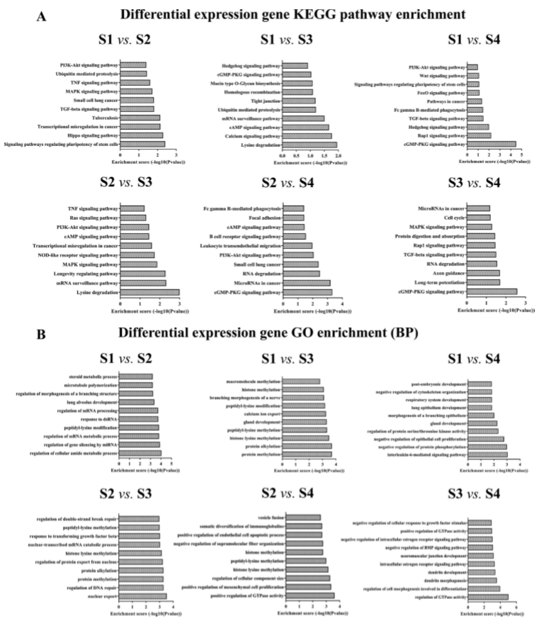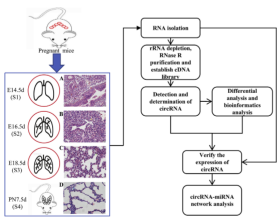 本研究通过对小鼠胚胎肺的4个不同阶段样品进行circRNA-seq,鉴定差异表达circRNA,并通过定量PCR技术验证circRNA的表达变化。随后通过分析其亲本基因的GO分析和KEGG通路分析,以及circRNA-miRNA-mRNA网络,预测胚胎胚相关circRNA的功能,为进一步研究circRNA在胚胎肺发育过程中的作用提供理论依据。
