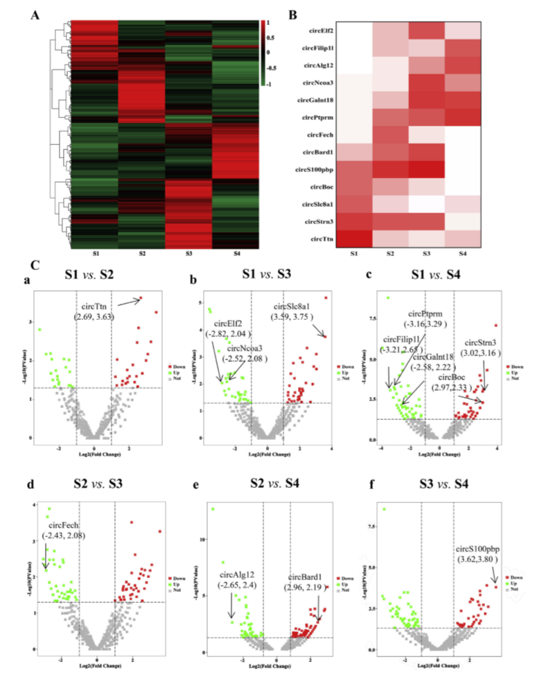 作者通过比较四个时期circRNA的表达水平,共鉴定了1,735个circRNA,选择520个差异倍数大于2,p value小于0.05的circRNA进行下一步分析。