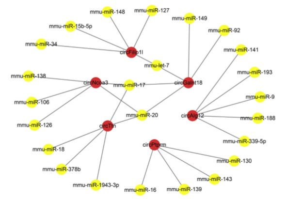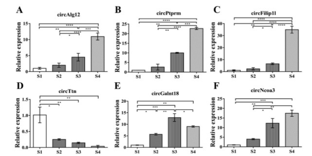 为证实测序结果的可靠性,通过qRT-PCR验证了13个差异表达的circRNA中的六个(circGalnt18、circAlg12、circFilip1、circTtn、circPtprm和circNcoa3)。qRT-PCR结果证实circGalnt18、circAlg12、circFilipl1、circPtprm、circNcoa3和circTtn的差异表达与测序结果一致,表明circRNA-seq结果的可靠性。