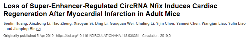- Huang S, Li X, Zheng H, et al. Loss of Super-Enhancer-Regulated CircRNA Nfix Induces Cardiac Regeneration After Myocardial Infarction in Adult Mice. Circulation. 2019 Apr 5. doi: 10.1161/CIRCULATIONAHA.118.038361.
