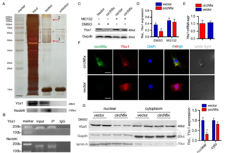 biotin探针捕获circNfix技术鉴定出富集最多的蛋白就是Ybx1。WB和RIP实验证明了circNfix与Ybx1的结合作用;敲低circNfix表达显著性抑制Ybx1蛋白的表达,而不抑制 Ybx1 mRNA的表达,但MG132处理可以抑制Ybx1蛋白的降解,提示Ybx1蛋白有可能经泛素蛋白酶体途径降解;敲低或过表达circNfix 分别可以减少或者增加Ybx1的泛素化。质谱分析结果发现E3泛素连接酶Nedd4l有可能参与Ybx1的泛素化降解。Protein docking program预测和Co-IP证明了Ybx1和Nedd4l的相互结合。RNA pulldown和 RIP实验则证明了circNfix与Nedd4l的相互结合作用。circNfix的表达不会影响到Nedd4l的表达,而会影响到Ybx1 与 Nedd4l的相互作用。沉默Nedd4l的表达增加Ybx1蛋白的稳定性,抵消了circNfix过表达后降低Ybx1蛋白的效应。