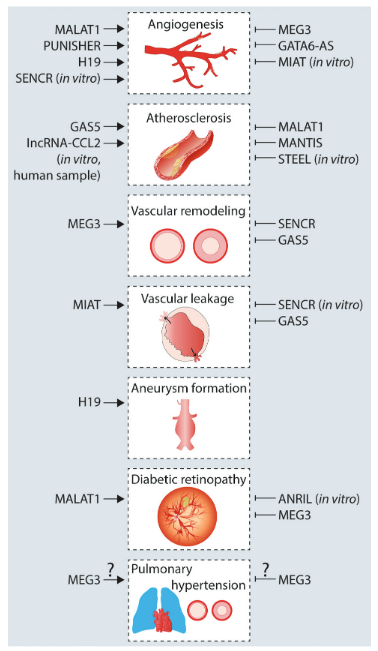 增强子RNA和假基因的转录本在控制血管稳态或疾病中也可能具有重要功能。增强子相关的lncRNA LEENE促进RNA聚合酶II在eNOS(内皮型一氧化氮合酶)启动子上的募集,从而促进eNOS转录。最近发现一种缺氧控制的增强子RNA HERNA,它是由心脏的病理性应激诱导的,抑制HERNA可以保护小鼠免受应激诱导的病理性肥大。