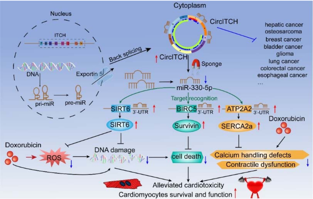 2020年5月11日,中国人民解放军总医院的曹丰教授在Circulation Research(IF=15.862)杂志上发表了一篇题为“The Tumor-Suppressive Human Circular RNA CircITCH Sponges miR-330-5p to Ameliorate Doxorubicin-Induced Cardiotoxicity Through Upregulating SIRT6, Survivin, and SERCA2a ”的文章,阐述 CircITCH,一种抑制肿瘤的广谱环状RNA,通过调节miR-330-5p-SIRT6/Survivin/SERCA2a轴来减轻阿霉素诱导的心脏毒性([1])。