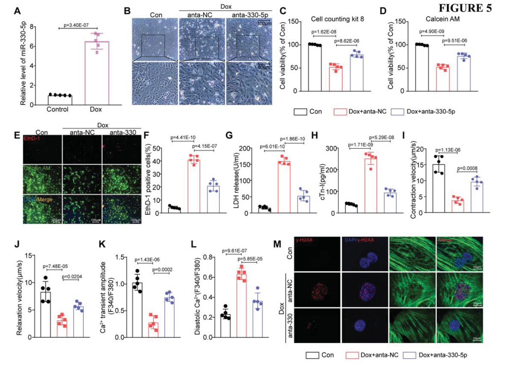 为了研究miR-330-5p在DOXIC中的作用,首先检测了在DOX处理HiPSC-CM后miR-330-5p的水平,发现miR-330-5p的水平显著上调。因此,进行了miRNA抑制实验,结果显示,抑制miR-330-5p可提高细胞存活率、减少细胞死亡、抑制LDH和cTnI泄漏、改善hiPSC-CM的收缩和舒张速度、提高钙振幅、减轻舒张期钙超载、减弱细胞/线粒体的DNA损伤和氧化应激,其作用与CircITCH过表达后相似。这些结果表明,miR-330-5p抑制剂能显著抑制HiPSC-CM的DOXIC。