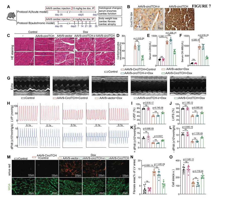 为了确定在体内CircITCH是否减弱DOXIC,采用AAV9的载体系统来使CircITCH在体内过表达。由于CircITCH在人与小鼠之间高度保守,因此作者使用人的CircITCH序列构建了AAV9 CircITCH过表达构建体(AAV9-CircITCH),以评估AAV9 CircITCH的治疗效果。过表达效率被原位杂交或qPCR证实。在小鼠DOX处理的急性(protocol A)和亚慢性(protocol B)模型中,测试CircITCH过表达的作用。在急性模型中,通过苏木精-伊红染色观察到CircITCH的过表达减少了DOX诱导的心室组织中广泛的空泡化。CircITCH过表达有效地降低了DOX诱导的血清天冬氨酸氨基转移酶(AST)、乳酸脱氢酶(LDH)和肌酸激酶-肌肉/脑(CK-MB)的水平,它们均代表心肌损伤。此外,包括超声心动图和侵入性血流动力学方法在内的功能性心脏研究表明,CircITCH的过表达显着改善了DOX诱导的左室射血分数(LVEF)、左室分数缩短(LVFS)、左室收缩末期和舒张末期压力(LVESP)以及左室压力的一阶导数(±LV dp / dt max,收缩功能指标)的降低,并且CircITCH的过表达降低了DOX触发的左室舒张末期高压(LVEDP)的升高。然而,在急性模型中,心脏重构和体重减轻并不明显。在亚慢性模型中,CircITCH的过表达减轻了DOX诱导的小鼠体重下降、左心室心肌纤维化和心肌萎缩。此外,在DOX处理的第14天和第35天,作者还观察到亚慢性模型中的EF、FS、LVSP、LVEDP和±dp/dt有类似的功能改善。